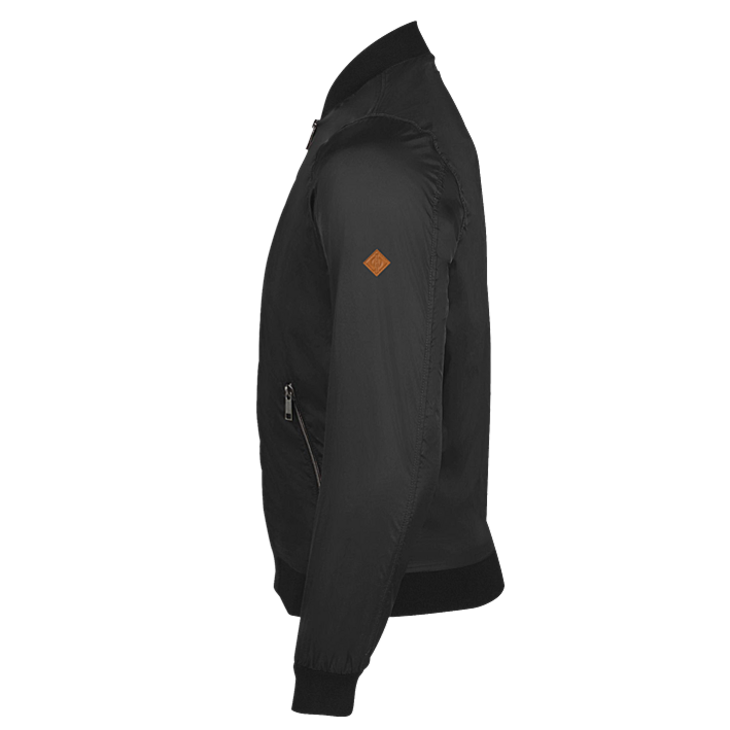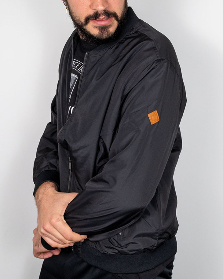 Unisex Fliegerjacke in schwarz mit aufgenähtem Leder-Logopatch auf dem linken Arm