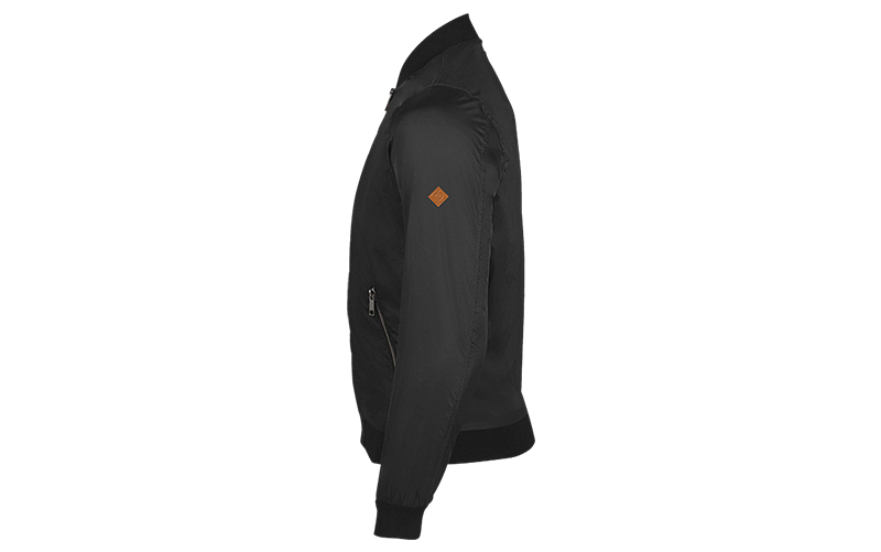 Unisex Fliegerjacke in schwarz mit aufgenähtem Leder-Logopatch auf dem linken Arm