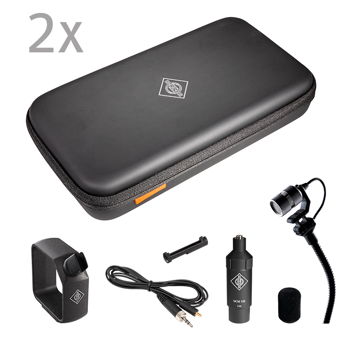 Complete stereo set for using the Miniature Clip Mic system in/on a piano or grand piano. Contains two each of: KK 14 capsule, SH 150 gooseneck, KC 1 cable brace, AC 31 cable, MCM 100 output stage, WS 110 wind shield, MC 8 clip. Delivered in two handy soft cases.