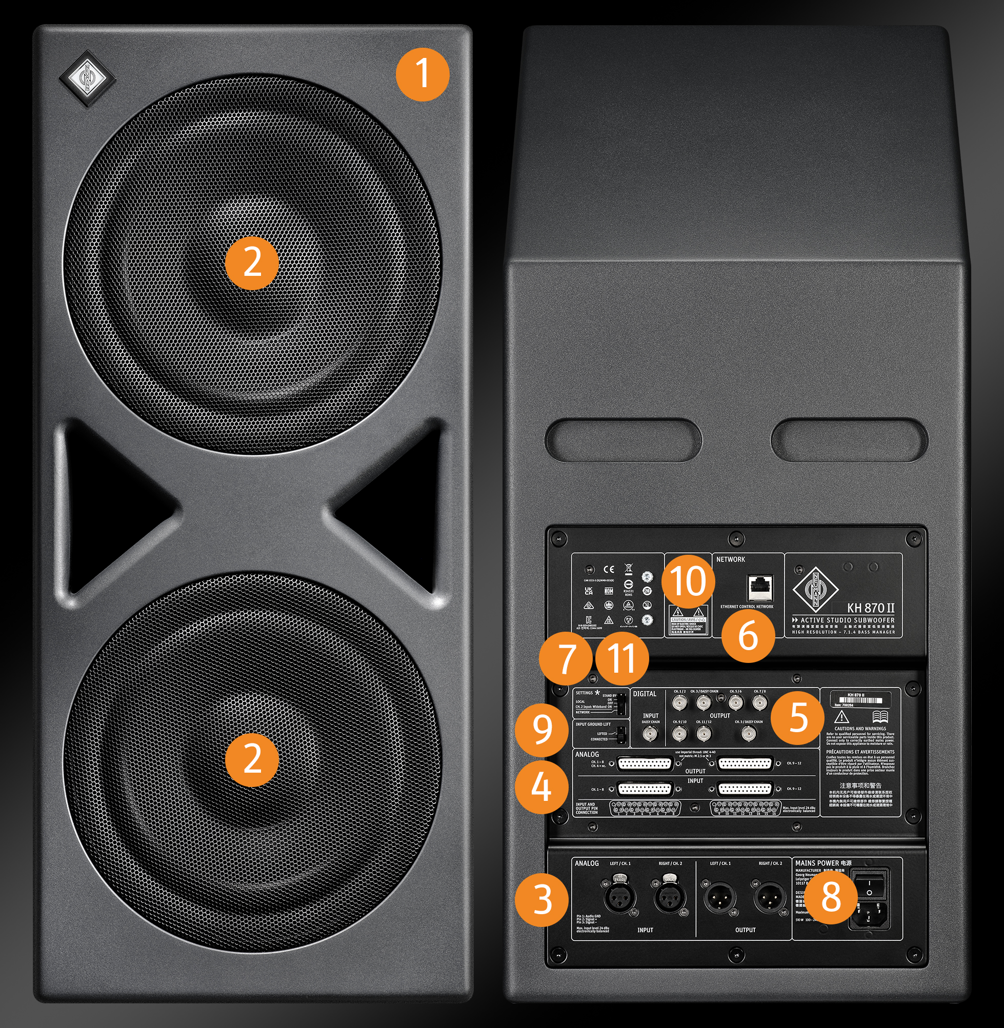 The KH 870 II is the perfect subwoofer for larger rooms, providing powerful bass extension with Neumann precision. It includes a unique and flexible Bass Manager for stereo, surround and immersive systems up to 7.1.4. Analog and digital outputs provide flexible connectivity to up to 11 studio monitors.