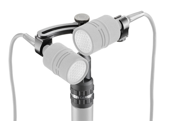 The other pair of holders allows stereo setups according to the "Coincidence Method": Capsules are installed acoustically at one point in space, however, freely adjustable to any angle between 30° and 180°.