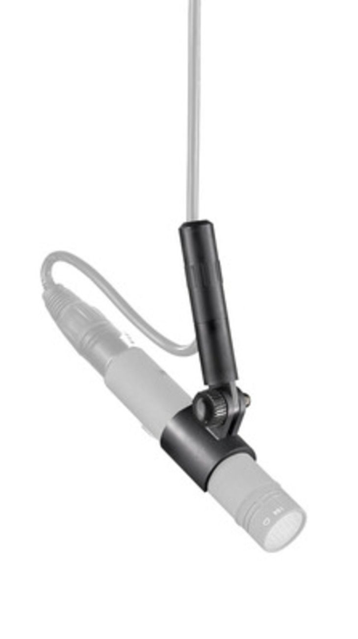 Auditorium hanger to adjust the tilting angle of a suspended microphone.