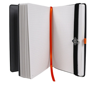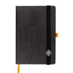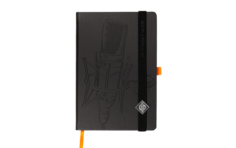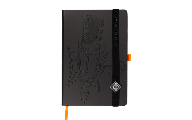 Lanybook DIN A5, black cover, Soft Touch material, with embossing on the front, motif U 67 microphone, elastic band with Neumann metal logo pin, pen holder and bookmark, 200 pages, FSC paper inside | (W x H) 145 x 210 mm