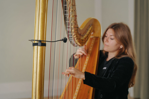 Universal strap clip to mount the gooseneck of the Miniature Clip Mic system on a oboe, clarinet, recorder, bassoon, flute, harp