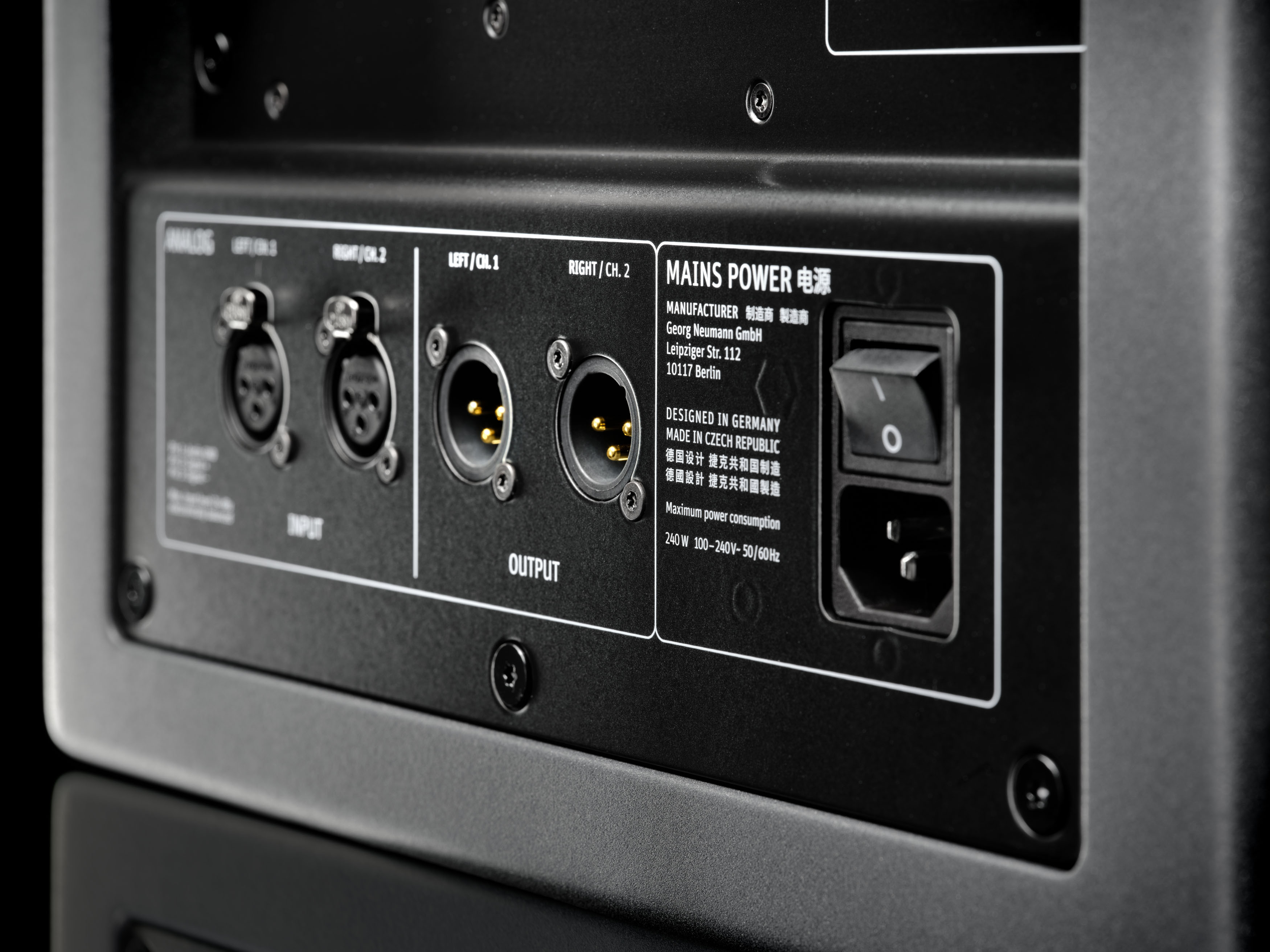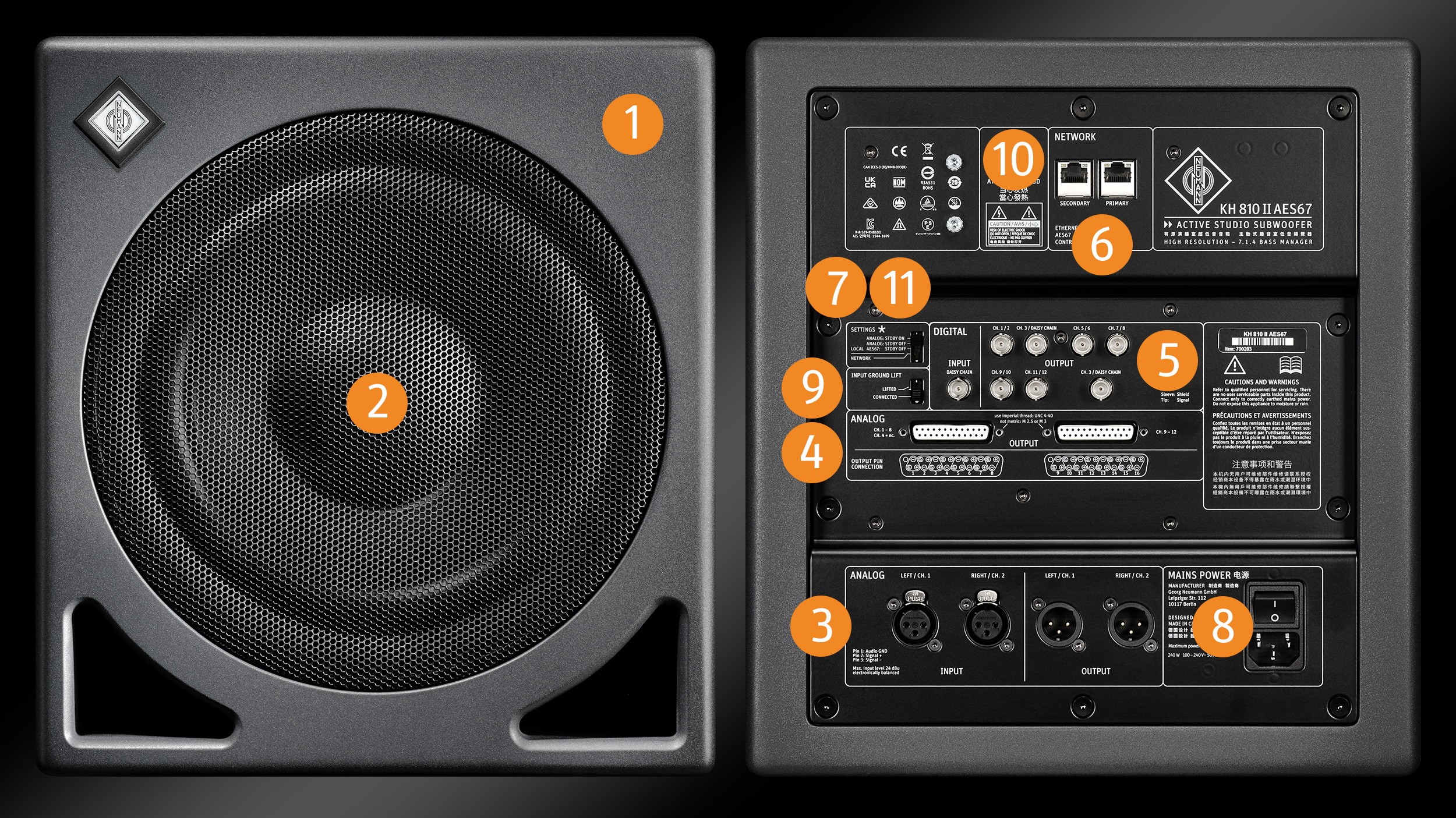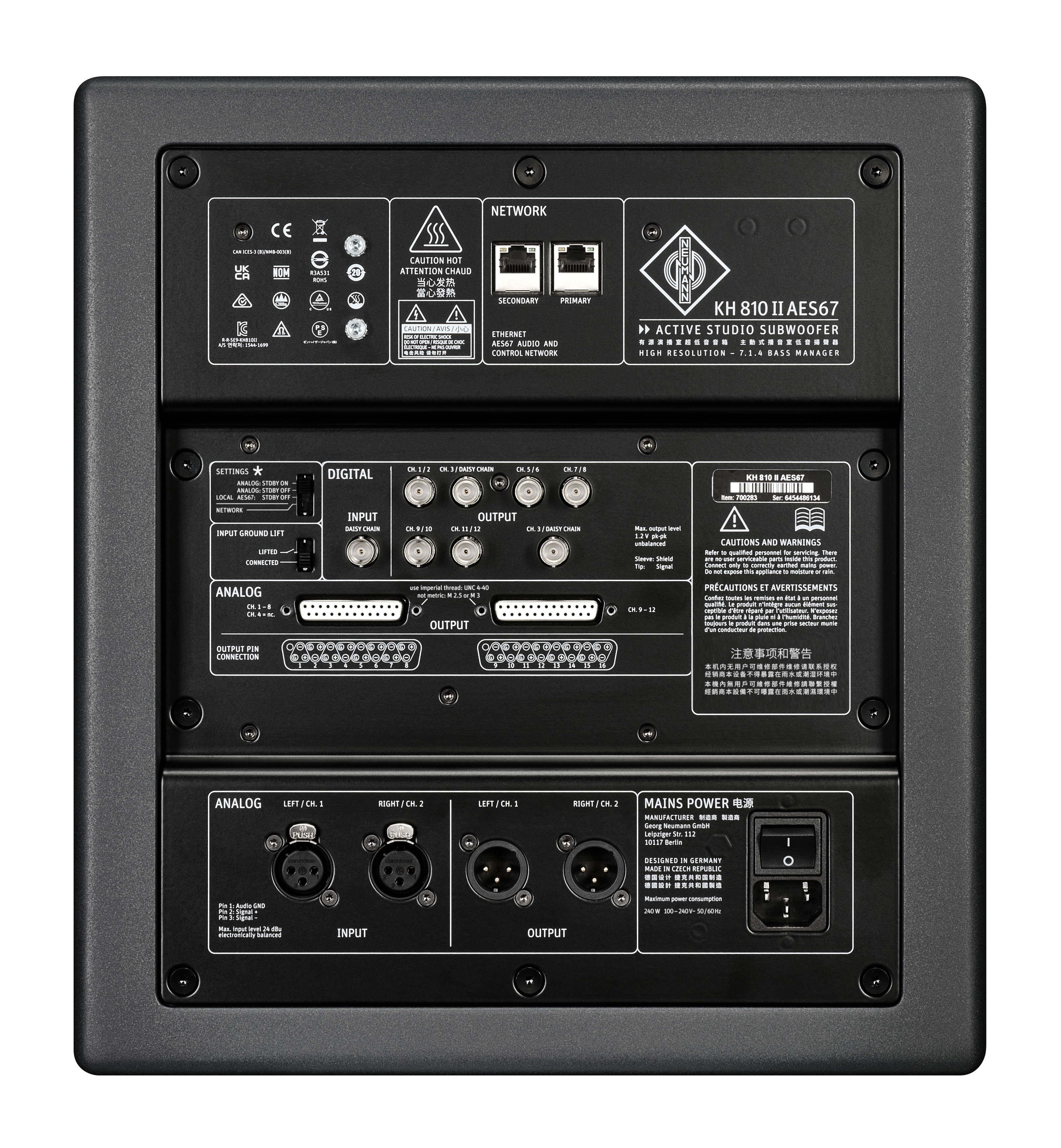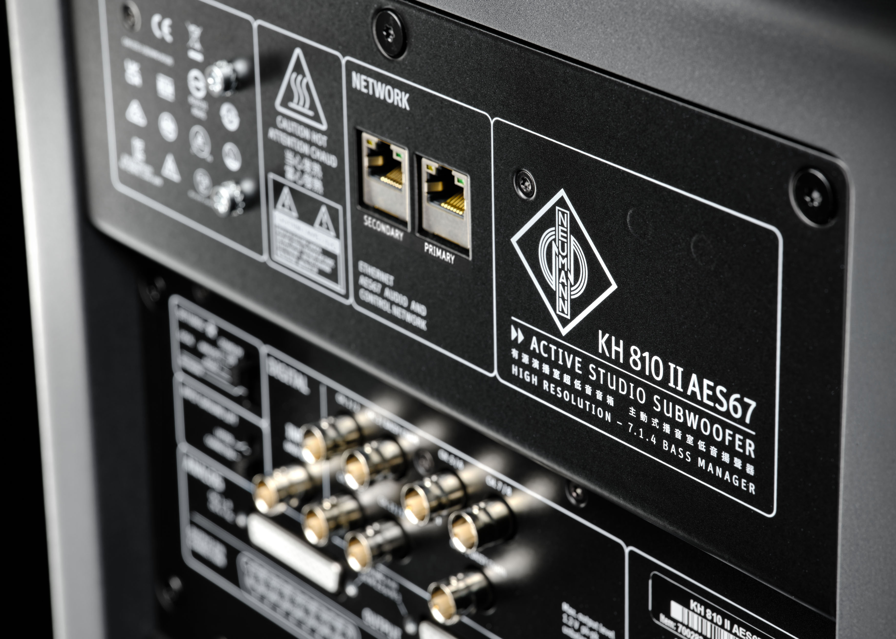 Duas entradas e saídas XLR analógicas estão disponíveis para conectar o subwoofer para operação estéreo. Para operação multicanal, o KH 810 II AES67 oferece dois conectores Sub D25 para conexão analógica, além de sete saídas AES3 (BNC) para conexão digital a 11 monitores de estúdio. Todas as entradas e saídas analógicas são balanceadas eletronicamente. As saídas AES3 (BNC) são compatíveis com entradas S/P-DIF em monitores de estúdio Neumann usando um cabo BNC para RCA.